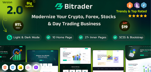 Bitrader HTML Template v2.0: Your gateway to modern trading. Crafted with Bootstrap 5.3X and SCSS using BEM methodology, it offers seamless user experience for crypto, stock, forex, and day trading websites.